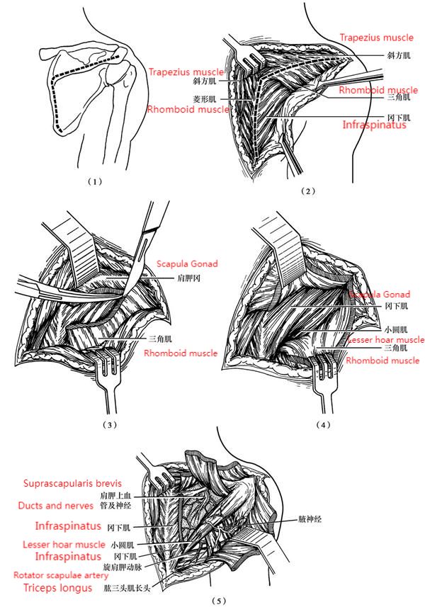 (1) incision; (2) incision of the muscle line; (3) severing the deltoid muscle from the scapular ridge; (4) lifting the deltoid muscle to reveal the infraspinatus and teres minor; (5) stripping the infraspinatus muscle to reveal the dorsal aspect of the scapula with vascular anastomosis