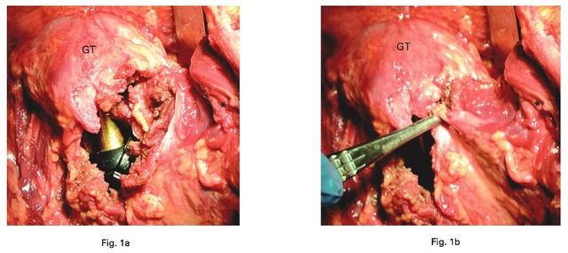 Fig. 2 1a. Complete transection of the gluteus minimus tendon during the DA procedure due to the need for femoral fixation; 1b. Partial transection of the gluteus minimus showing the extent of injury to its tendon and muscle belly. gt. greater trochanter; * gluteus minimus.